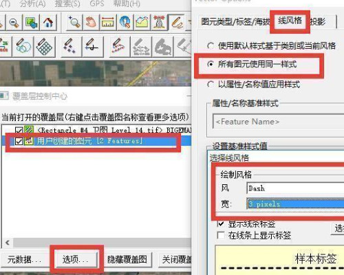 5、在弹出的对话框中,选中【用户创建的图元】,即:刚才规划的路径,然后点击【选项】,跳出窗口如下图:在弹出的对话框中点击【线风格】,勾选【所有图元使用同一样式】,在弹出对话框中选中线条的 样式和线条的 宽度以及 颜色。