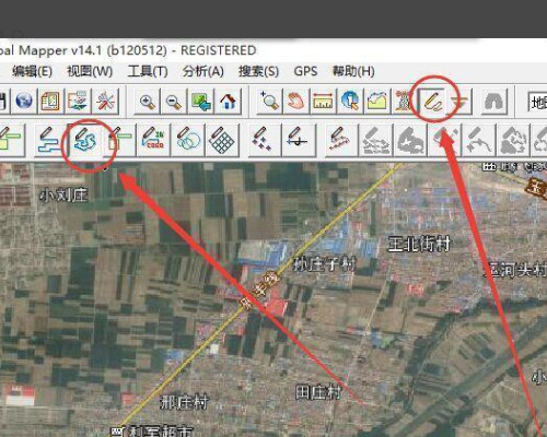 2、点击 Global mapper 工具栏上面的上方的 Digitizer Tool 数字化工具,然后选中左起第四个按钮”Create New Area (Trace Mode)"。