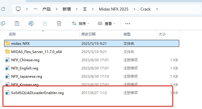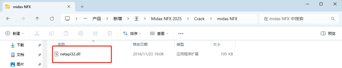 18、返回之前解压的“midas NFX 2025”文件夹,依次打开“Crack——midas NFX”文件夹,选中 ”netapi32.dll“文件夹,鼠标右键点击“复制”。