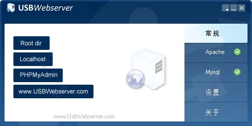 6.下次启动时,只需要双击usbwebserver.exe,瞬间就能帮你一键搭建好“Apache + PHP + MySQL”环境。而且,你之前曾做的一切配置、网站代码、数据库什么的都会保留着,非常人性化
