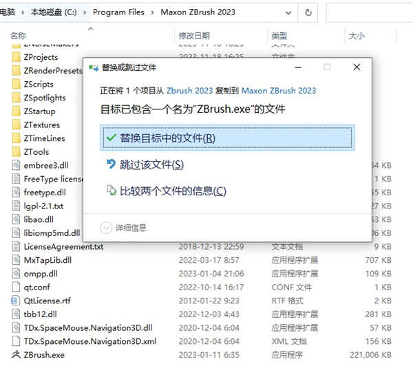 3、拷贝ZBrush.exe到安装目录下(默认C:\Program Files\Pixologic\ZBrush 2023),替换即可。