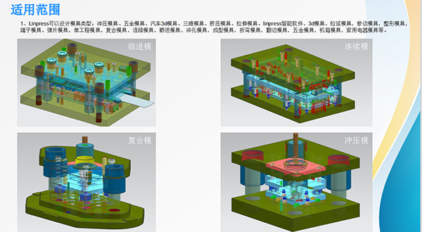 Linpress NX冲模设计软件免费版可以设计模具类型:冲压模具、五金模具、汽车3d模具、三维模具、挤压模具、拉伸模具、linpress智能软件、3d模具、拉延模具,修边模具,整形模具,端子模具,弹片模具,单工程模具,复合模具,连续模具,顺送模具,冲孔模具,成型模具,折弯模具,翻边模具,五金模具,机箱模具,家用电器模具等。