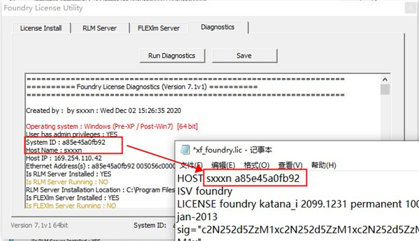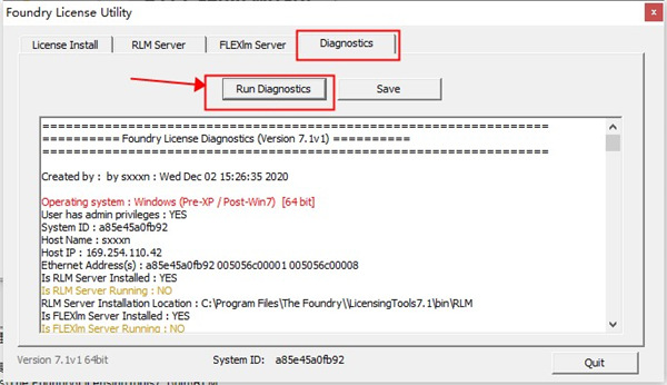 9、在开始菜单中,启动Foundry License Utility程序,选择Diagnostics—Run Diagnostics,获取本机信息,如下图所示: