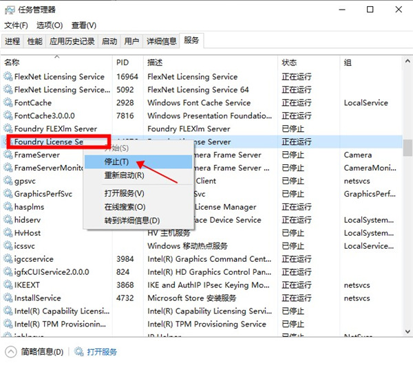 7、安装完成后,打开任务管理器,停止Foundry许可证服务器,找到Foundry License Server右键停止即可