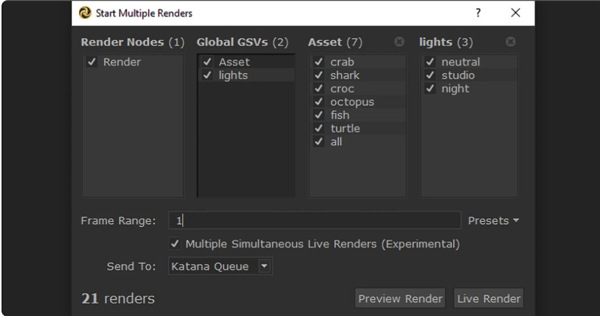 Katana 4.0包含一个提交一组渲染的示例工具,这些渲染支持一系列选项。这是一个创建简单用户界面的示例脚本,显示了Katana的前瞻渲染的强大缩放能力所产生的可能组合,使艺术家能够探索这些组合来适应他们的工作流程。