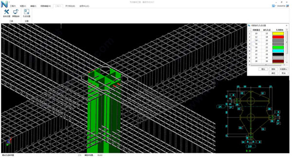 型钢遇钢筋的深化设计一直以来视为设计人员的痛点,预留孔洞的准确性往往难以保证,因此给现场带来不可估量的损失,返工引起的各种费用,截面积损失率增大甚至还会影响到整个结构的稳定性。鲁班节点对型钢具体位置开完洞之后,可输出对应的孔洞排列图纸,精准输出孔洞的具体位置,准确率达到百分之百,排列图利用不用的颜色表示不同的孔径大小,直观的表示出孔洞直径类型。