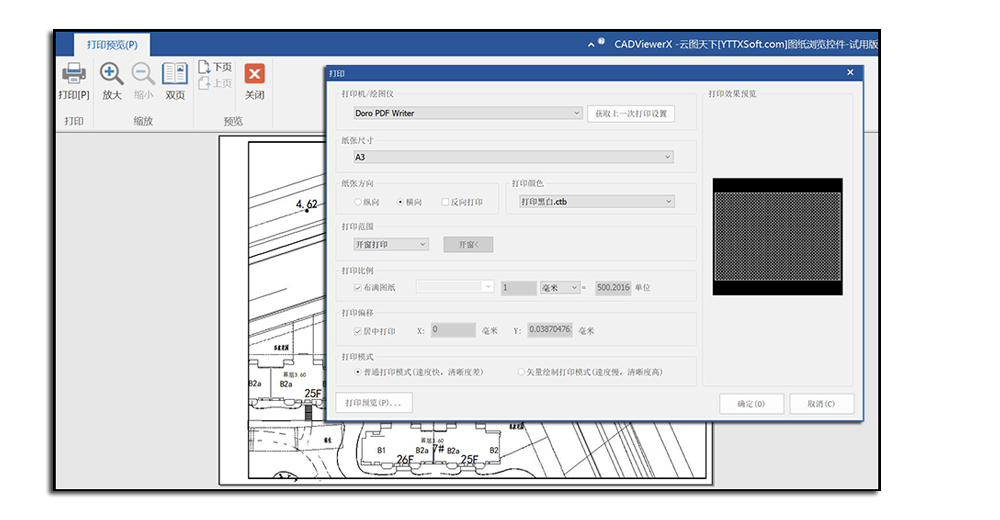 提供专业级的图纸打印功能,支持打印预览,可以拉框设置图纸的打印范围,并设置图纸的出图颜色和出图纸张。