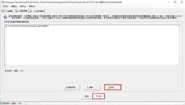 2、选择基本图像数据库,这是用来当马赛克效果的基本图,最低需要一百张用于填充制作马赛克拼图图像,这样就能制作出更好的效果图,同时没有这么多图的用户们可以再网上下载一些,添加好后点击下一步