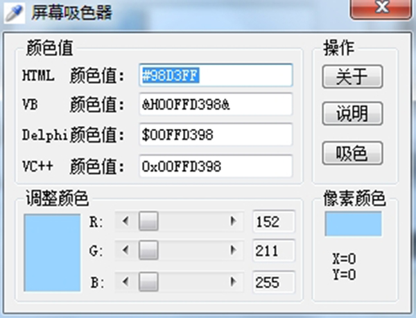 这款屏幕吸色器真是编程和设计人员的福音啊,它完全免费又小巧,不用安装直接就能用,特别方便。我觉得最实用的就是它能精准吸取屏幕上任何像素点的颜色,不管是做网页还是搞开发,再也不用对着色卡一个个去查了,直接吸一下就能转换成各种编程工具需要的颜色代码,省时又省力。它还贴心地分了精简版和完全版,根据需求切换就好。最让我惊喜的是那个放大镜功能,取色时能放大看细节,避免选错颜色,这对做精细设计的人来说太重要了。颜色收藏夹我也经常用,遇到好看的配色直接存起来,下次做项目就能直接调用,不用重新找。操作起来也简单,按住吸管图标拖到目标位置松手就行,新手也能秒上手。虽然它还有定时关机这种看似不相关的功能,但整体来看确实是个轻量级但功能齐全的取色神器,值得收藏在工具箱里。屏幕吸色器是一款免费小巧的屏幕取色工具。屏幕吸色器可以吸取屏幕上任意一像素点的颜色,并转换为各种编程工具的颜色值。还可以由任意一种颜色值得到R、G、B三原色的值,及其对应的其它编程工具的颜色表示值。此小工具是绿色,小巧,易用。如果您是编程人员的话免不了用上色值,这款屏幕吸色器是一个色只提取软件,非常好用,可以让您在您电脑上提取任何一种您用得到的颜色,并且将其转换为编程使用的色值工具,取材变得轻而易举,不需要繁琐的查找,有需要的话下载体验一番吧 功能介绍 1、分为精简版和完全版,不同需求时可轻松切换 2、颜色自动生成7种颜色代码供参考复制 3、屏幕放大镜,做到更加精准的颜色采集 4、定时关机功能 5、颜色收藏夹能够将吸取过来的颜色储存起来供以后使用 使用说明 1、鼠标摁住软件左上角的吸管图标不放,将鼠标拖到要吸取颜色的位置,松开鼠标即可完成取色 2、将颜色收藏起来可供以后使用