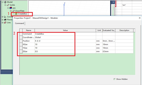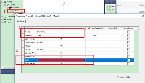 4、双击Box1,设置Name为“DownPlate”,Material设置为“pec”(理想导体),设置颜色。
