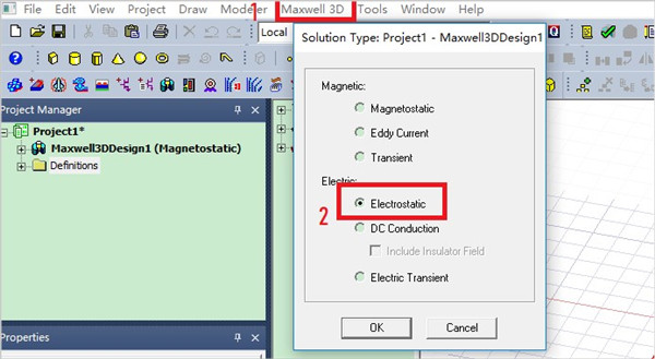 2、点击Maxwell 3D—>solution type—>Electrostatic—>OK