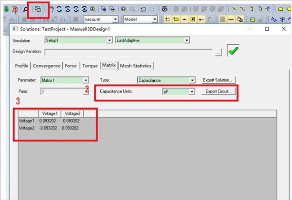 8、设置求解矩阵。点击Maxwell 3D—>Parameters—>Assign—>Matrix,勾选Voltage1,Voltage2。