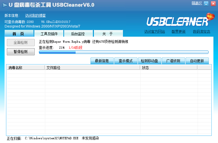 1、病毒侦测包括全面检测,广谱检测以及移动盘检测,全面检测可精确查杀已知的U盘病毒,并对这些U盘病毒对系统的破坏作出修复,广谱检测可快速检测未知的U盘病毒,并向用户发出警报,移动盘检测,检测U盘,MP3等移动设备的专门模块,要独立使用。