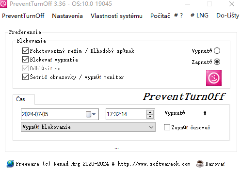 PreventTurnOff是一款防电脑黑屏软件,软件可以确保PC和显示器保持打开状态,用户能够根据软件设置台式电脑主机和显示屏的情况,适用实际时间设置,能够避免一段时间内电脑屏关掉或进到休眠模式。