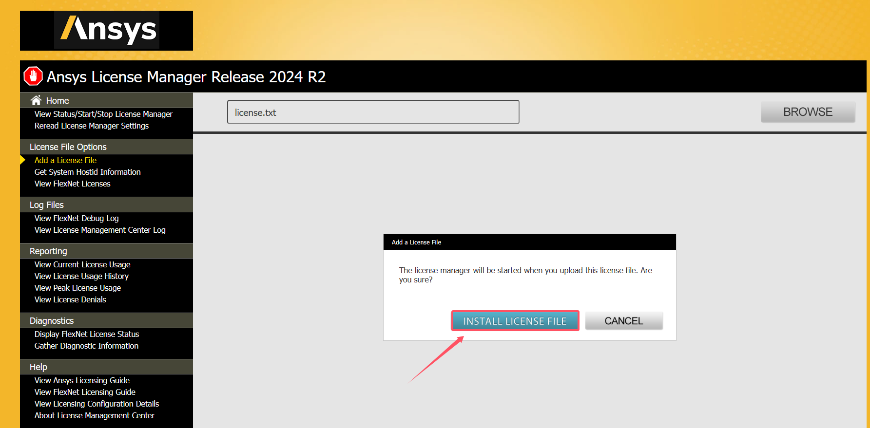 21、弹出对话框,点击【INSTALL LICENSE FILE】