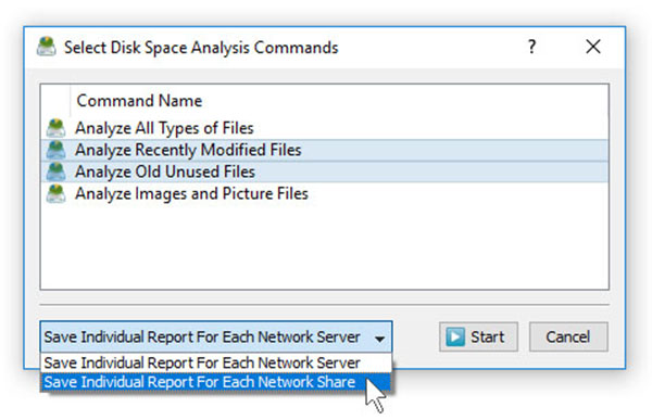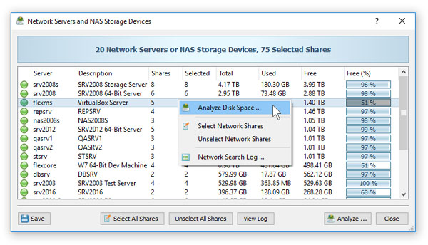 在最简单的情况下,只需按主工具栏上的“网络”按钮,搜索网络上的所有网络服务器和NAS存储设备,选择一台或多台要分析的服务器,按鼠标右键并选择“批处理磁盘”空间分析”菜单项。Disk Savvy Pro将显示一系列预配置的磁盘空间分析命令,使您可以选择一个或多个要在所有选定的网络服务器和NAS存储设备上执行的命令。