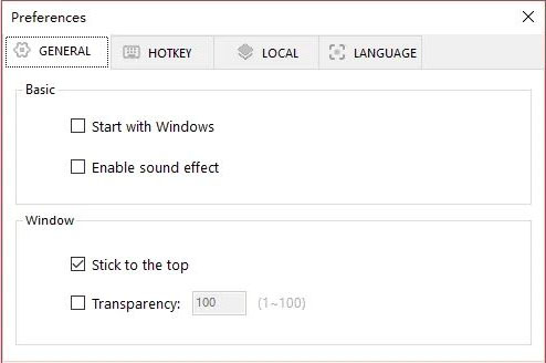 通用: 你可以允许软体开机启动。启用截图成功时的音效提醒。“窗体置顶”在你有很多窗体同时打开时,将非常有用。同时,你可以调整窗体的透明度;