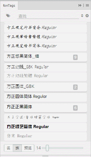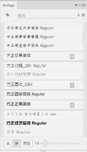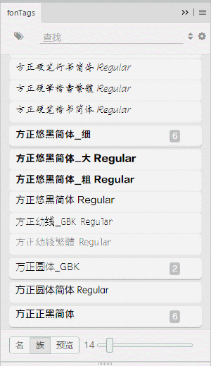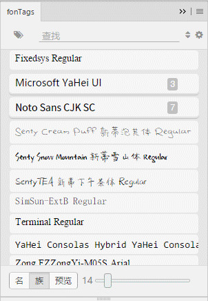 在 fonTags 中,同一字族的字体会被自动合并为一个字体组显示,你可以通过点击展开或者收起一个字体组。
