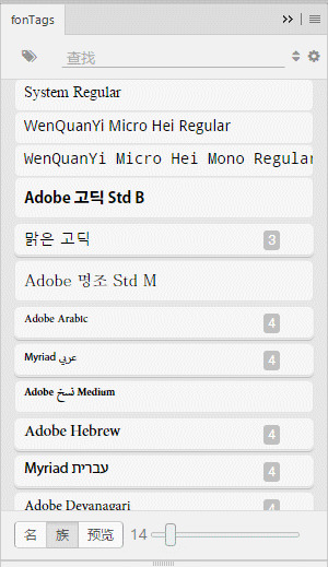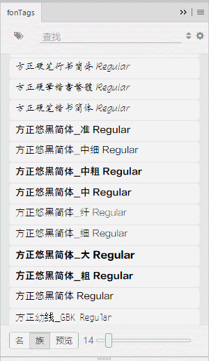 标签会从上到下的筛选,只有满足所有条件的字体才会显示在字体列表中,如果只想指定个别类型的标签,可以在其他类型标签中选择“全部”。
