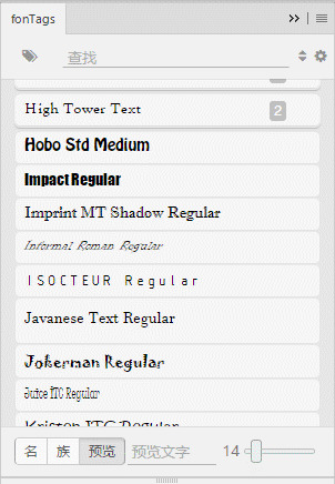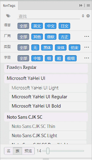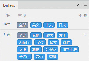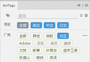 扫描完字体后,就可以看到字体列表了, fonTags 会自动为字体添加一些简单的标签,比如厂商和语言。不过自动添加的可能并不全面和准确(后面会介绍如何编辑标签和自定义标签),通过标签筛选器可以根据标签来寻找字体。