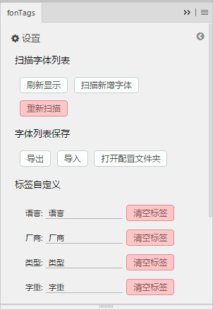 重新扫描字体列表。会丢失当前字体列表(包括标签),当 fonTags 使用出现问题的时候,可以试一试,相当于清空设置。