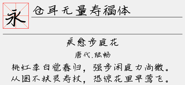 仓耳无量寿福体字体是由仓耳字库推出的一款楷书类字体,字体采用了端正整洁的楷书风格,充分的为我们展现了现代人的审美观。字形规范、结构端正,其风格较为平正中和,笔画转折处遒劲有力。字面较为扁平宽阔,且字库完整。可以很好的应用于文本装潢、信息展示、网页设计、篆刻制模、数据制作、装潢设计、计算艺术设计、视觉设计、字帖等一切合法应用场景,有喜欢的朋友可免费下载收藏。
