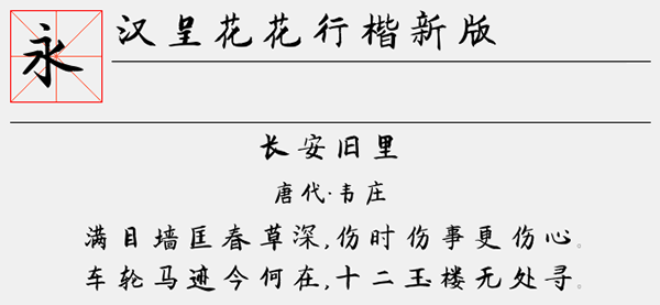 汉呈花花行楷新版字体是一款非常优秀的中文字体,字体线条粗细适中,全体风格十分的超卓,笔画神韵超逸、端秀大方,看起来非常实在,比较贴切生活。并且它给人的感觉非常的大气端正,而且字形正楷。可以很好的应用于文本装潢、信息展示、网页设计、篆刻制模、数据制作、装潢设计、计算艺术设计、视觉设计、字帖等一切合法应用场景,有喜欢的朋友可免费下载收藏。