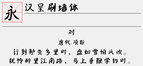 汉呈刷墙体字体是由汉呈字库出品的一款非常漂亮的书法字体,其整体风格清新醒目、时尚柔美,精致富有内涵。不仅工整简洁,还字体笔画偏黑粗,具有强烈的视觉冲击力,并整体的字形框架比较的整齐美观,有着很好的视觉效果,可以很好的应用于文本装潢、信息展示、网页设计、篆刻制模、数据制作、装潢设计、计算艺术设计、视觉设计、字帖等一切合法应用场景,有喜欢的朋友可免费下载收藏。