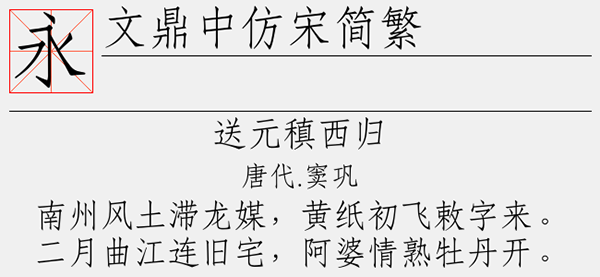 文鼎中仿宋简繁字体是一款粗细适中的仿宋繁体字体,由文鼎字库出品。该字体笔触粗细适中,书写端正,具有很好的视觉感。同时还完美的传承宋体的特点,字体风格紧凑严谨,笔画舒展,横画的尖突与勾、点、提的圆润处理相呼应,刚柔并济、工整而不失精巧,最大程度的展现笔画的柔和秀美,有极强的视觉表现力。可以很好的应用于文本装潢、信息展示、网页设计、篆刻制模、数据制作、装潢设计、计算艺术设计、视觉设计、字帖等一切合法应用场景,有喜欢的朋友可免费下载收藏。