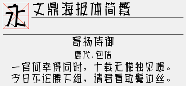 文鼎海报体简繁字体由文鼎字库出品的一款简繁体字体,其字体非常粗壮有力,字形大方得体,并横竖撇都带有自己的风格,同时字体的角度、大小、距离都设计得非常恰当,整体效果极佳 ,文鼎海报体繁体非常粗壮有力,字形大方得体,整体效果非常出色,并且字库完整。可以很好的应用于文本装潢、信息展示、网页设计、篆刻制模、数据制作、装潢设计、计算艺术设计、视觉设计、字帖等一切合法应用场景,有喜欢的朋友可免费下载收藏。