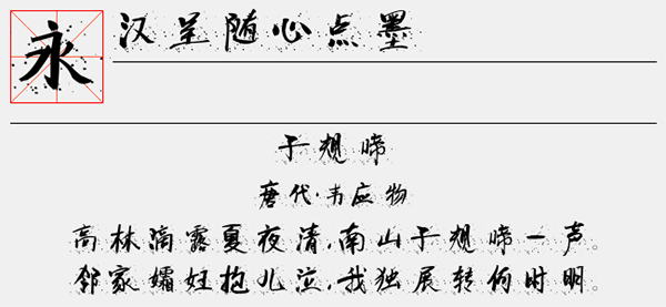 汉呈随心点墨字体是一款非常漂亮的书法字体,在每个字体的背后,都会有墨点出现,增加了字体的装饰艺术效果,非常有意思。看起来非常漂亮,将唯一字体添加到字体框架以进行装饰,与其名字相呼应。可以很好的应用于文本装潢、信息展示、网页设计、篆刻制模、数据制作、装潢设计、计算艺术设计、视觉设计、字帖等一切合法应用场景,有喜欢的朋友可免费下载收藏。