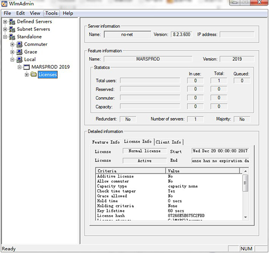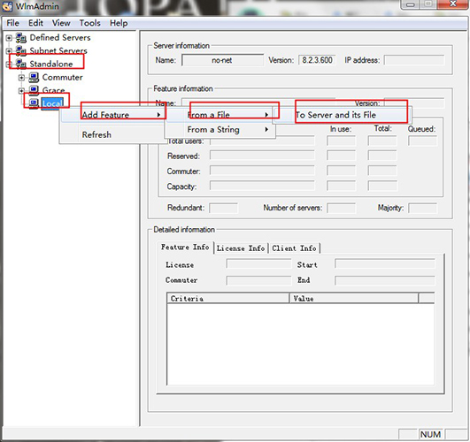 5、运行WlmAdmin,选择Standlone—>右键local,依次选择Add Feature—>From a File—>To Server and its File—>浏览选择lservrc许可证文件夹安装许可即可。
