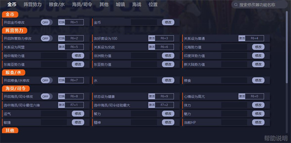 2.开启金币修改:开启后,在航行时修改或点击航线图,点击上方阵营修改[己方阵营/金币可见阵营]。