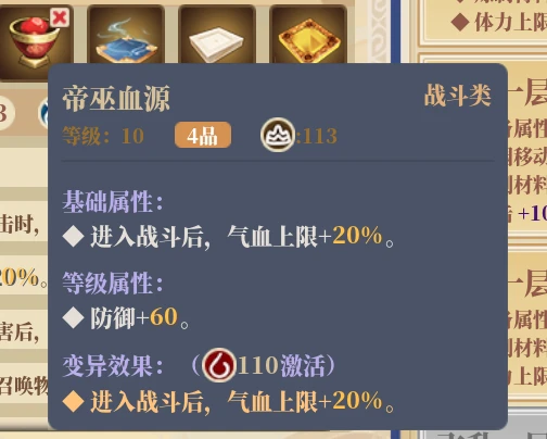 3、帝巫血源(天魔遗蜕四级宝箱大量获取,不断炼制可提升到10级,10级提供113点土属性):大幅度增加主角气血,与年兽的尾效果配合,可以增加闪避的回血数值。