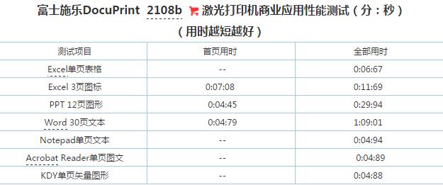 4. 以上就是这款富士施乐DocuPrint 2108b激光打印机的打印速度,在表格中明显可看出该机在单页打印和连续输出上,其速度都很占优势,文档出纸速度相当快,打印体验很好;此外,该机在30页连续Word打印输出上,仅用了1分多钟,于同类型其他品牌激光机相比,这个速度已经非常出色了