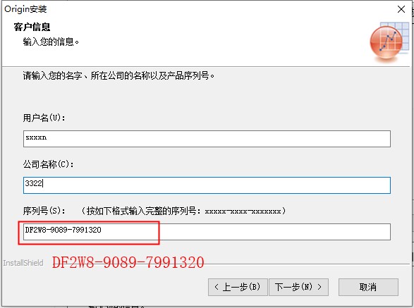 3、之后用户名和公司名称都可以随便写,输入序列号【DF2W8-9089-7991320】点击下一步安装;