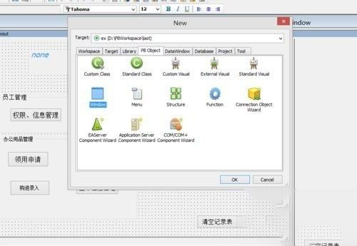 7、现在我们的框架已经完全打好了,现在该干嘛就干嘛啦,现在就展示一个添加窗口进行用户界面开发的步骤,我们还是选择 File->New 第四个选项卡中的 Object ,选择窗口(Window) 点击 OK