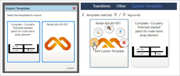 Antenna Magus徽标已用作部分模板中的占位符。要对其进行更改,请将鼠标悬停在现有缩略图上,然后选择“替换”。选择“ thumbnail.png”文件。在工作区的顶部,将天线模板的名称更改为“圆极化堆叠式贴片,用于宽带阵列元件”。