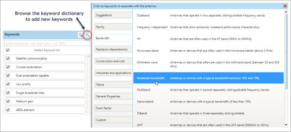 在Antenna Magus中使用搜索词来搜索数据库。可以将两种类型的搜索字词(称为“关键字”)添加到模板中。第一种是Antenna Magus关键字词典中包含的预定义关键字,而第二种则包括用户定义的自定义关键字。根据该论文,该天线的带宽为15%。在Antenna Magus中,这被称为“中等带宽”,用于描述工作带宽在10%到70%之间的所有天线。要将“中等带宽”关键字添加到此模板,请单击“浏览关键字”按钮并导航到“带宽”。或者,使用文本框搜索关键字。