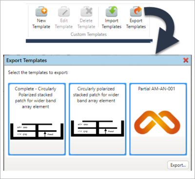 可以将自定义Antenna Magus模板导出并保存到外部位置,以进行备份和分发。在“主页”选项卡中,单击“导出模板”按钮以打开“导出模板”对话框,在“天线数据库”中显示所有自定义模板。选择其中一个图标,然后单击“导出”以将模板保存到方便的位置。