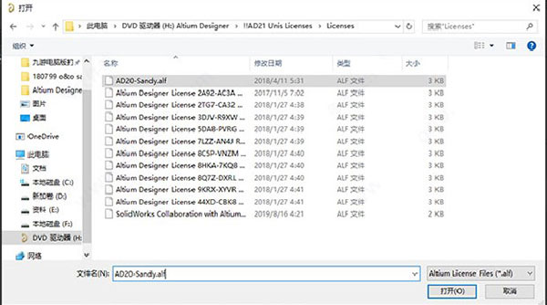 7、将会弹出一个窗口,然后打开软件初始安装包ad211 unis licewnses文件夹,找到AD20-Sandy.alf文件,单击选中它后再点击打开;