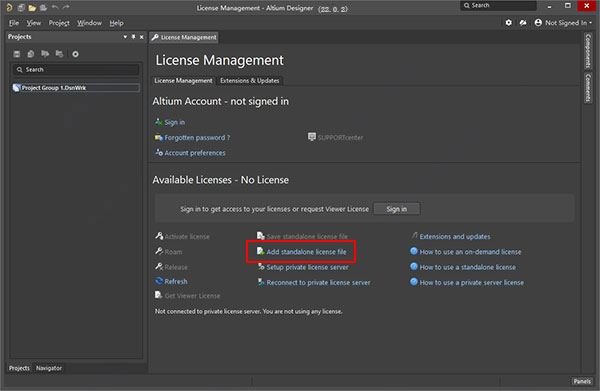 6、因为没有在创建桌面快捷方式,所以可以在电脑左下角搜索并打开软件,点击界面中的【Add standalone license file】;