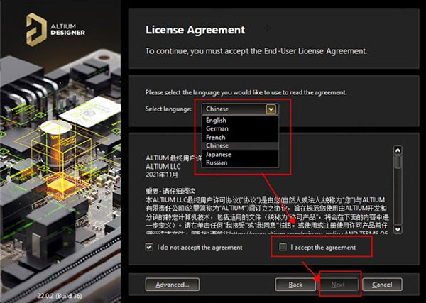3、在Select language栏下拉列表中选择“Chinese”语言,然后勾选安装许可协议,再点击Next。