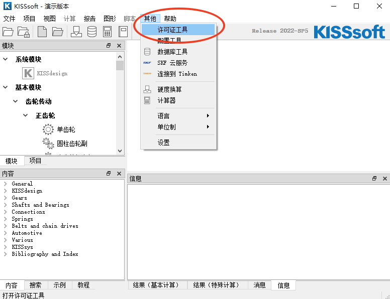 17、启动KISSsoft 2022软件,依次点击【其它】、【许可证工具】。