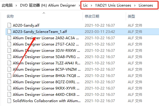 15、弹出窗口,找到软件安装包\Lic\!!AD21 Unis Licenses\Licenses里面的AD23-Sandy_ScienceTeam_1.alf打开。