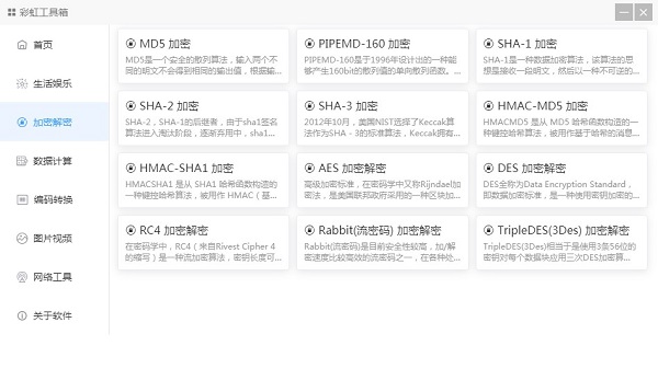 md5加密、PIPEMD-160加密、SHA-1加密、SHA-2加密、SHA-3加密、HMAC-MD5加密、HMAC-SHA1加密、AES加密解密、DES加密解密、RC4加密解密、rabbit流密码加密解密、tripledes加密解密
