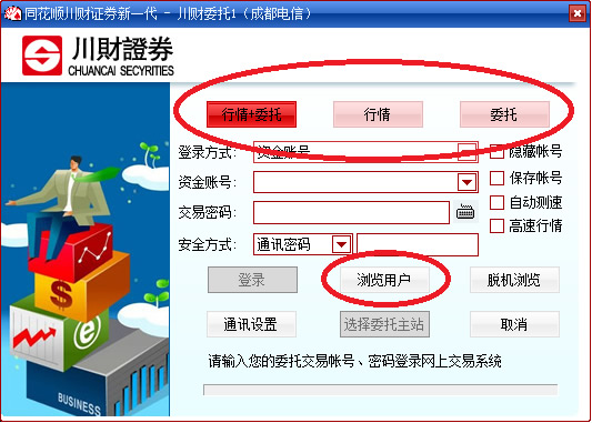 最上方是三种登录模式:“行情+委托”、“行情”和“委托”,鼠标点击即可选择其一。登录时输入的账号密码信息与以前“委托”登录时输入的内容是完全一样的,然后点击“登录”,分别进入如下界面: