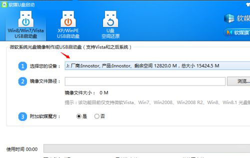 1、在电脑中打开软媒U盘启动工具,然后,如果你制作的系统是win7或win8则选择第一个选项卡,如果是xp或winpe则选择第二选项卡。