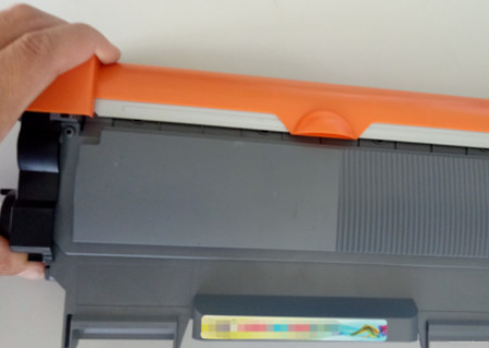 2、旋转上盖露出加碳粉口,握住碳粉瓶来回摇晃几下使碳粉均匀,然后去除瓶身的橙色固定材料。