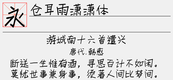 仓耳雨潇潇体是一款由仓耳字库独家制作发行的艺术字体,该字体字迹清晰,笔画粗细均匀,看似杂乱的结构,但一笔一划之间其实有种洒脱不羁的独特美感,颇受用户们的喜爱和欢迎。该字体适应于报纸和杂志和书籍中常用字体海报、个性促进品牌标志设计、字体设计、文本装潢、信息展示、篆刻制模英文、数据制作、装潢设计、视觉设计、字帖等一切合法应用场景,有喜欢的朋友可免费下载收藏。